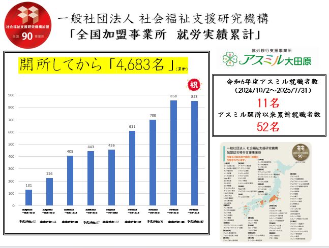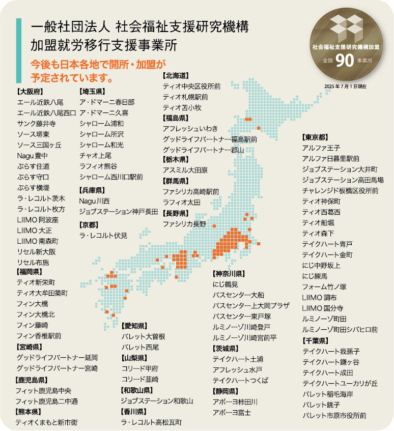 アスミル大田原は、全国ネットワークの「一般社団法人社会福祉支援研究機構」に加盟しています。(2025年7月1日現在で90事業所)今後も日本各地で加盟店が増えていく予定です。